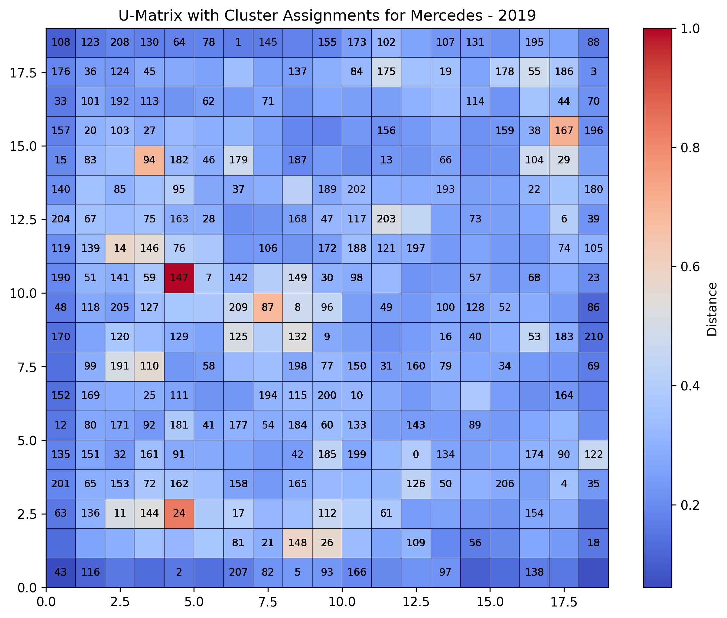 Leveraged Self-Organizing Maps for unsupervised clustering of high-dimensional telemetry data, reducing complexity while preserving topological relationships. Configured SOM with 400 iterations, learning rate of 0.5, and Gaussian neighborhood function. Applied the Apriori algorithm with 0.2 minimum support threshold to discover association rules within optimal lap clusters. Performed extensive feature engineering including fuel load simulation, average sector times, and tire life tracking. Evaluated clustering quality using Silhouette Score, Calinski-Harabasz Index, and Davies-Bouldin Index.