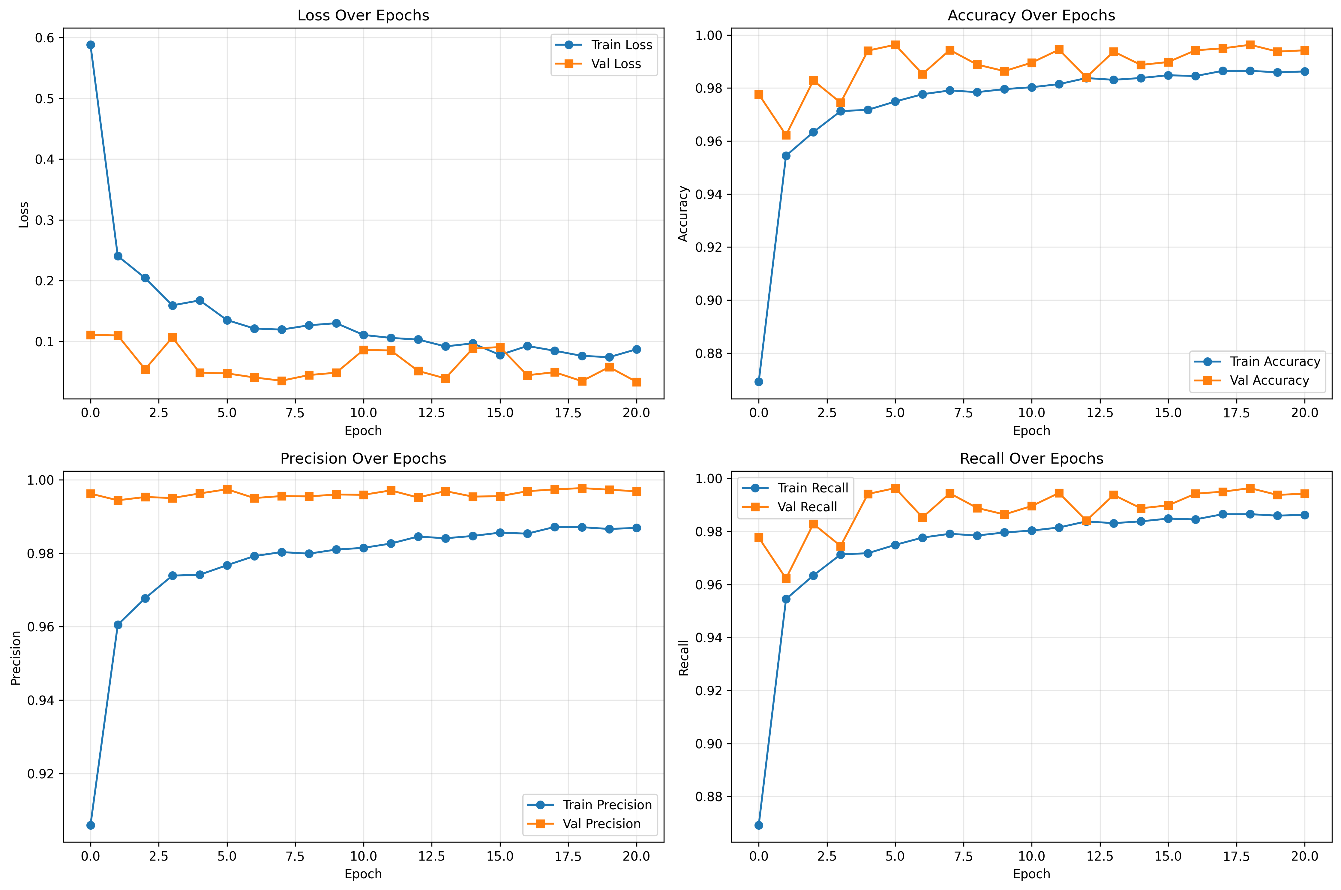 Achieved exceptional performance with 99.63% test accuracy on 118,595 wafer samples, surpassing the target range of 85-95%. The model demonstrated 99%+ weighted F1-score across all 9 defect classes, even on minority classes with limited samples. Converged in just 6 epochs (~3 hours on A100 GPU) with stable training and no overfitting. The lightweight model (21MB, 5.5M parameters) enables fast inference (<10ms per image), making it production-ready for real-time quality control in semiconductor fabs.